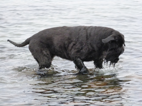 Chica hat mit mir dann das volle Programm erlebt, Welpenkindergarten, Hundeschule, Hundeplatz, ich wollte schließlich nichts falsch machen. Überall war sie dabei, da wo ich war, da war auch meine Chica. Auf dem Hundeplatz hat sie die Begleithundeprüfung erfolgreich bestanden, bei den Spaziergängen war sie ein Teufel. Als junger Hund war sie wirklich eine richtige Wildsau. Wenn Chica mit ihren Freunden in den Siegwiesen getobt hat, sind wir Menschen häufiger zu Fall gekommen, denn wenn zwei tobende Riesenschnauzer von hinten in die Kniekehlen rammen, bleibt niemand mehr stehen. Aber man musste ja toben, da blieb keine Zeit zum gucken. Die ersten Jahre waren wirklich anstrengend, denn wirklich müde habe ich Chica nie bekommen. Außer im Urlaub auf Texel, da war sie dann wirklich platt. Den ganzen Tag auf den Beinen, soviel neue Gerüche und dann das große Wasser.... wo sie doch so eine Wasserratte war. Wären wir einmal in der Wüste gewesen, Chica hätte Wasser gefunden. Wasser hatte sie immer in der Nase. Und dann war sie nicht mehr zu halten. Leider waren das dann nicht immer nur kristallklare Gebirgsbäche, sondern auch schon mal verschlammte Tümpel.